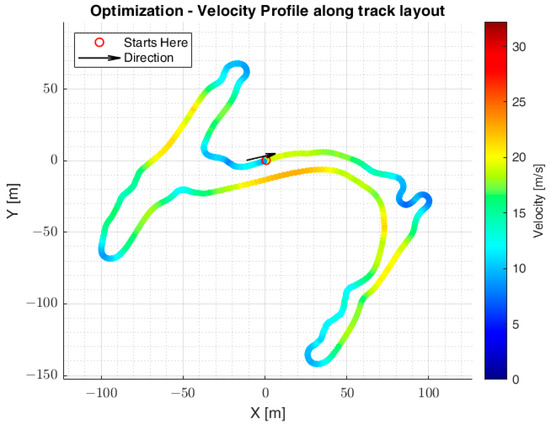 After the initial Autocross runs, the battery pack was charged back up to nearly 95%. In the meantime, the track data were extracted, and the offline optimization was performed. The result for the velocity profile around the layout can be consulted in Figure 16.