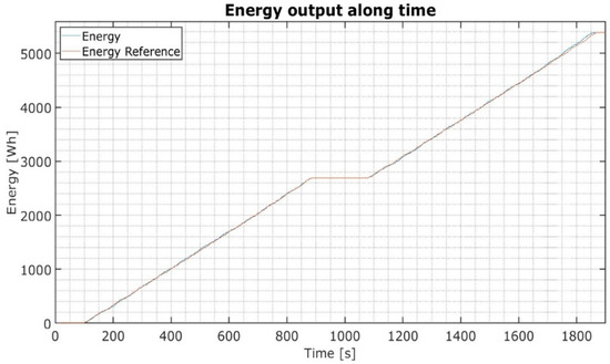 In reality, the FST12 completed the full Alverca endurance run in 1574.6 s, consuming a total energy of 5.383 kWh. An onboard video of one of the endurance laps can be found in https://youtu.be/jT0GfjM5nTc?si=CtbzNcQ4KxO0plLC (accessed on 12 December 2024). Compared to the optimization-based simulation, the results are presented in Table 7, with each respective deviation. Furthermore, the power limit adjustments over time compared to the real power output are shown in Figure 17, and one can see that over the run, it allowed for proper adherence to the energy reference line, as shown in Figure 18. The run’s total distance estimation resulted in 19,894 m, which deviated from the expected measured 19,448 m (22 laps of 884 m each) by 2%. The deviation between the simulation and experimental results may originate from several sources: deviation of the model’s parameters, discretization of the models, and the errors associated with the distance estimation methodology to determine the real position of the car throughout the track. However, it should be noted that the discretization of the model and the calibration of the tire model should have a higher impact for this deviation. These assumptions were required to allow for a good trade-off between accuracy and computational time, which is required for the score optimization problem.