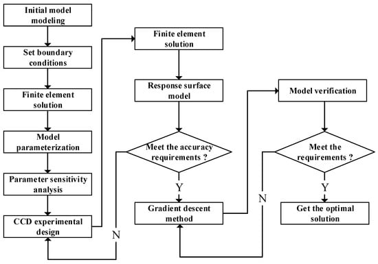 In this study, a response surface optimization design method, incorporating the response surface model and gradient descent algorithm, is employed to optimize an A-type floating body. First, a parametric model was developed based on the initial model with predefined boundary conditions, and the finite element analysis was conducted. Moreover, the PB (Plackett–Burman) and CCD (Central Composite Design) tests were performed to analyze the parameter sensitivity of the model variables and to establish the response surface mode. The response surface equation was then optimized using the gradient descent method. Finally, the optimized model was verified under extreme conditions. The specific operation process is illustrated in Figure 1. The follow-up sections in this chapter describe the development of the initial model and stress strength analysis.