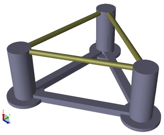 The FOWT platform primarily consists of buoy columns, heave plates, pontoons, and diagonal and transverse braces, arranged in a triangular configuration. The wind turbine tower is set at the top of one of the three columns, while the ballast tank and empty cabin are set inside the buoy column, heave plate, and pontoon to maintain the equilibrium between the platform’s overall gravity and buoyancy of the platform. The main parameters of the model and the schematic diagram of the model are presented in Table 1 and Figure 2, respectively.
