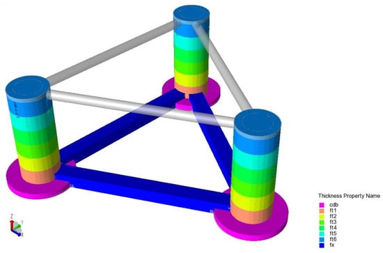 According to DNV GL-OS-C103 [], the structural design should satisfy the strength requirement below the material yield stress with a proper safety factor. In this study, Q355 steel, which exhibits a yield strength of 355 MPa, was employed. After taking into account a safety factor of 1.25, the structural stresses were required to remain below 284 MPa. The results of the structural strength assessment under 13 conditions are listed, and all cases satisfy the required specifications. Based on this validated initial model, structural optimization was subsequently carried out.