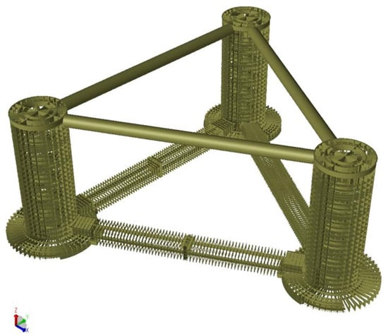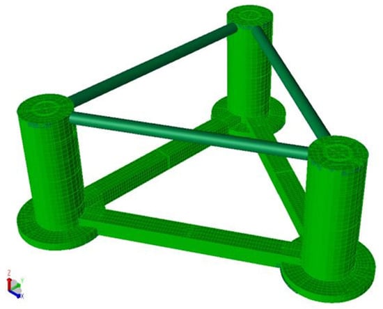 Based on the structural parameters of the floating platform, the initial model was established in GeniE software, consisting of components such as buoy, pontoon, heave plate, diagonal brace, and transverse brace. To accurately represent the real properties of the structure, the buoy, pontoon, heave plate, bulkhead, and rib plate were modeled as plate elements, while the diagonal brace, transverse brace, and internal skeleton were constructed using beam elements. Additionally, the interior was separated by ribs, and the overall strength of the model was ensured by the steel structure framework. This finite element model was meshed with a size of 2 m, as shown in Figure 6.