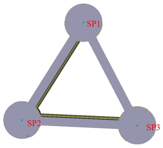 In order to make up for the limitation that mooring system cannot be set directly on the platform in GeniE software 2021, equivalent boundary conditions were adopted to simulate the mooring effect [], as shown in Figure 5. Regarding the translational degrees of freedom at the center point of heave columns, the first point (SP1) is constrained in the X-, Y- and Z-axis directions; the second point (SP2) is restricted along Y- and Z-axis directions; and the third point (SP3) is limited only in the Z-axis direction [].
