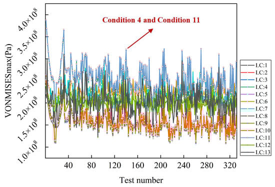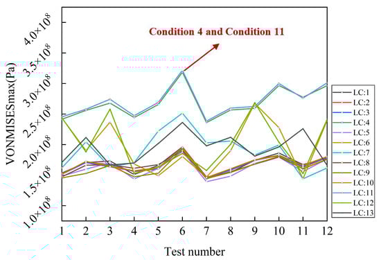After orthogonal tests, the distribution of the maximum and minimum stress results is shown in Figure 7. It is obvious that LC4 and LC11 are the most unfavorable among the 13 working conditions, thus the subsequent analysis should focus on these two conditions.
