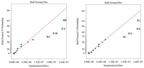 Half-normal plot of stress results under condition 4 (left) and condition 11 (right).