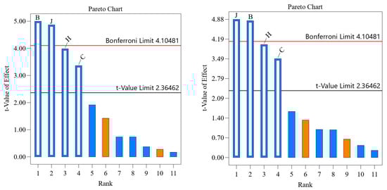 Normalized effect Pareto diagram of stress results under condition 4 (left) and condition 11 (right).