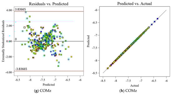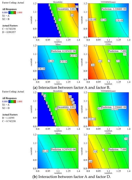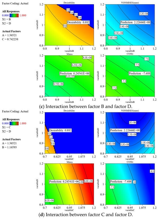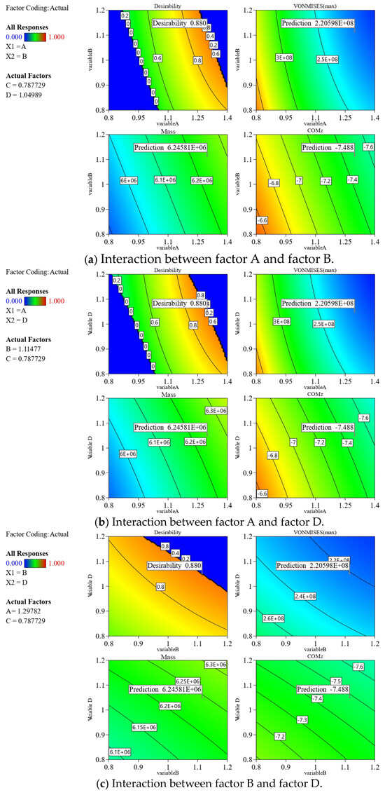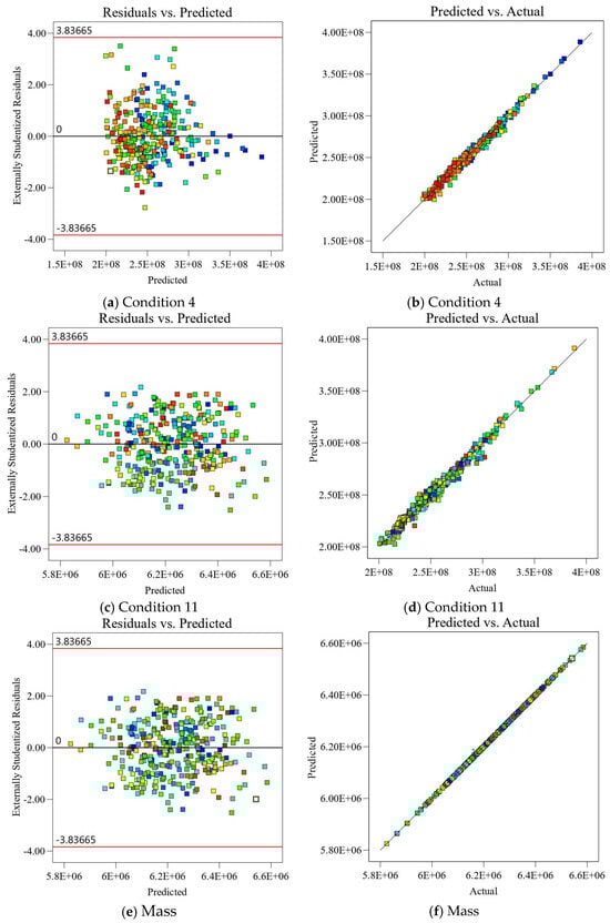 The results obtained by significance analysis of the model are shown in Table 11. It is observed that the four response value models of the von Mises stress under LC4 and LC 11, as well as the mass and the center of mass, are extremely significant (p < 0.05). As shown in Table 12, the model correlation coefficient and the correction coefficient are all above 0.98 with an excellent model fitting degree, where means all models can explain more than 98% of the response value changes. Therefore, each regression model can be used to analyze and predict the above-mentioned four response value models (A, B, C, D).