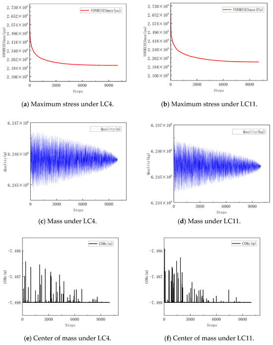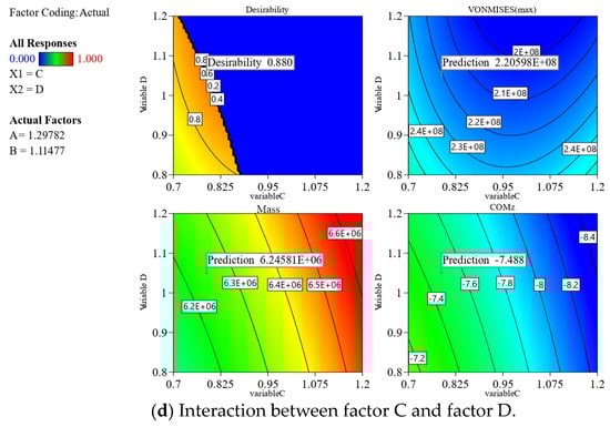In Figure 13, it is found that the mass and COMz predicted by the response surface model under LC11 remain within the allowable range, where the minimum solution of the largest predicted von Mises stress value is 2.23 × 108 Pa, whose credibility value is 0.882 with a fine predicted feasibility. Moreover, the variable values can be roughly estimated, thanks to the optimal value prediction point in the response surface model falls within the range of the four variables; subsequently, the response surface equation needs to be solved by using a numerical calculation method to determine the specific variable value.
