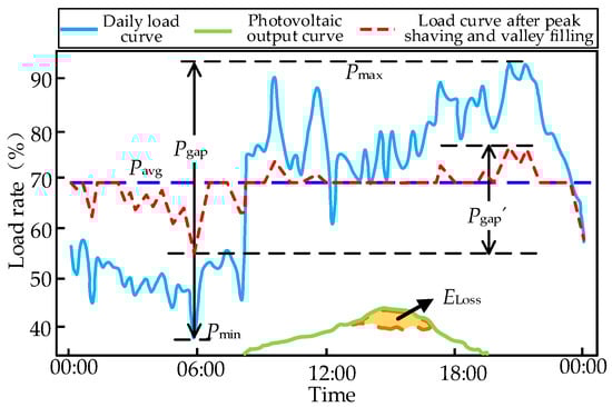 Pavg represents the 24 h average load of the feeder, PLoad,t represents the real-time power at t, and Pmax (Pmin) is the maximum (minimum) load of the whole day, respectively. Pc (Pd) represents the charge (discharge) power of Dess, Pgap (Pgap’) represents the peak–valley difference before (after) the DESS is connected to the feeder, and Eloss represents the light rejection. The optimization model of peak shaving and valley filling in the DESS [] is established. The process is as follows.