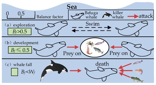 The inspiration for the beluga whale optimization (BWO) algorithm is shown in Figure 2, which establishes the three stages of exploration, development, and whale landing based on the swimming, hunting, and whale landing behaviors of beluga whales.