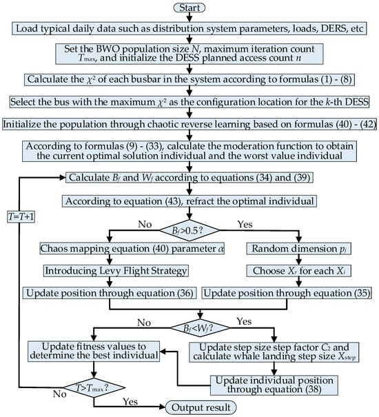 - An improved beluga whale optimization algorithm [,,] (TWBWO) is adopted to solve the optimal configuration function of DESSs for urban, old distribution network, obtaining better initial solutions and improving algorithm performance through chaotic reverse learning [], and introducing the refraction operation of the water wave algorithm into the beluga whale algorithm enhances its ability to escape from local optima [].