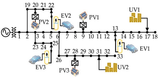 However, the DESSs of nodes 17 and 21 are close to the point of UV or EV access, and their DESS continuously discharges at maximum power from 20:00 to 22:00 to meet the electricity demand, and it is affected by EV and UV until after 4:00 to start charging, while the DESS of node 33 is less affected and starts charging at 2:00. Due to being far away from the PV access point, the DESS of node 17 absorbed less PV power in the afternoon than the other two groups. From this, it can be concluded that the charging and discharging conditions of the three groups of DESSs are relatively reasonable.