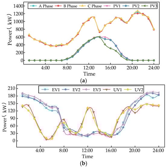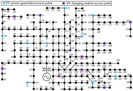 - Finally, the IEEE-33 node system is modified based on the distribution network operation data obtained from a certain area in Kunming for case analysis. The effectiveness of the proposed method is verified by setting different cases for simulation. In addition, the method is applied to a 199-node real-machine system selected in Kunming to measure the relevant indicators of the system, verifying the engineering practicality of the method in reducing the network loss, shifting the PV output, and solving the undervoltage, EV-induced overload, three-phase imbalance, and other aspects.