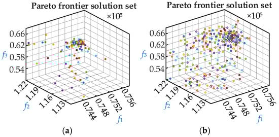 Distribution of the Pareto solutions for the different algorithms: (a) BWO algorithm; and (b) TWBWO algorithm.