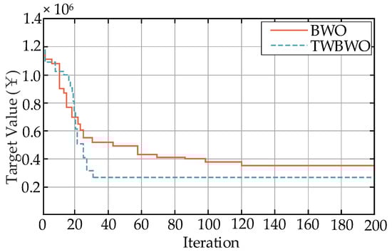 To demonstrate the superiority of the TWBWO algorithm over the BWO algorithm, Figure 7 compares the distribution of the Pareto front solution sets between the two algorithms. Figure 8 compares the iteration speed and convergence of the two.