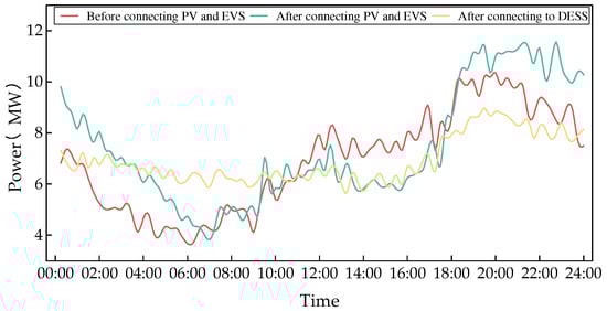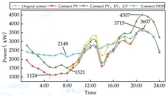 From Figure 9, it can be seen that after a large number of EVs and UVs were connected, the peak load of the system increased from 3715 kW to 4507 kW, an increase of 21.3%, causing the system to experience overload and overload situations. The integration of PV has to some extent alleviated the load of the system from 12:00–18:00, but it cannot alleviate the overload problem during the evening rush hour. After configuring the DESS, the peak load of the system decreased from 4507 kW to 3607 kW, a decrease of 20%. The peak–valley difference decreased from 2591 kW in the original system and 2986 kW with PV, EV, and UV added to 1459 kW, with a decrease of 43.7% and 51.1%, respectively. Therefore, the DESS configuration method proposed in this article has shown good results in terms of peak shaving and valley filling, as well as in shifting the PV output.