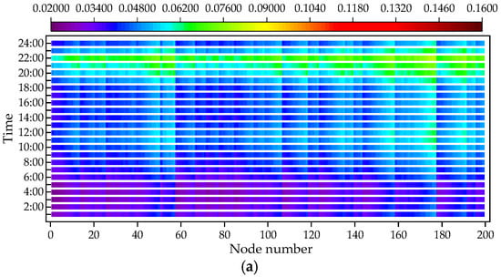 Connect the energy storage at the corresponding location and draw a thermal map of the CPFSV values of each node over time under different operating conditions, as in Figure 12.