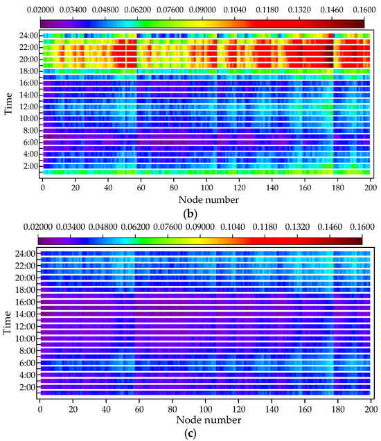 Heat map of the CPFSV value of 199 nodes over time: (a–c) corresponding to working conditions 1, 2, and 3.