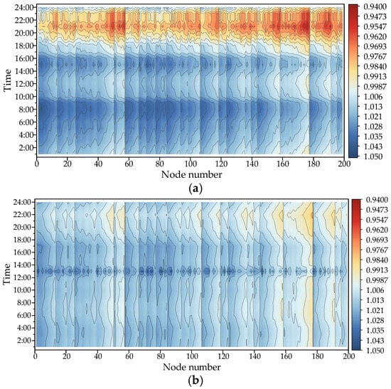 To verify the voltage management capability of the DESS, the voltage data of each node in the system were measured under operating conditions 2 and 3 on 26 and 27 July 2024. Contour plots of the voltage per unit value of each node as a function of the time were plotted, as shown in Figure 14.