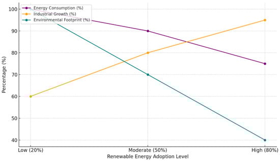 Furthermore, Figure 1 shows that as renewable energy adoption rises, energy consumption and the environmental footprint decrease, while industrial growth benefits. This highlights renewable energy’s role in supporting sustainable industrial expansion. The relationship among renewable energy, energy consumption, and industrial growth is essential for reducing industrial environmental impacts and aligning economic growth with global sustainability goals, like the Paris Agreement and the SDGs [23].