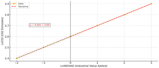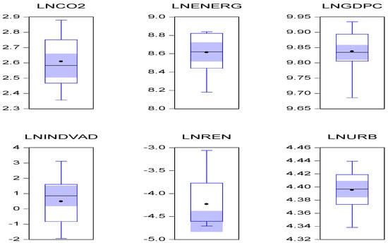 The descriptive analysis reveals that Ln INDVAD (industrial value-added) exhibits the highest variation, with a standard deviation of 1.498, indicating significant fluctuations in the industrial sector, as shown in Table 1. In contrast, Ln URB (urbanization) is the most stable variable, with minimal variation (standard deviation of 0.028). The maximum value is observed in Ln INDVAD (3.123), highlighting a significant peak, while it also has the lowest minimum value (−1.940), showing considerable variability. LnREN (renewable energy use) also has a notable minimum value of −4.707, reflecting periods of low renewable energy usage.