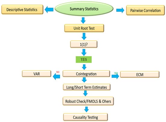 Evaluating the robustness of long-term coefficients in ARDL models can be effectively achieved through Fully Modified Ordinary Least Squares (FMOLS), Dynamic Ordinary Least Squares (DOLS), and Canonical Cointegrating Regression (CCR) techniques. These methods address common time series challenges, such as serial correlation and heteroscedasticity, ensuring reliable and consistent estimates of long-term relationships. FMOLS and DOLS are widely recognized for producing statistically significant results, as shown in studies, such as [62], which examined bank performance in Cambodia. CCR further provides a robust framework for cointegration analysis, making it suitable for verifying ARDL outcomes. Additionally, these methods are valuable in panel data contexts where cross-sectional dependence and structural breaks may affect estimates, as noted by [63]. Together, FMOLS, DOLS, and CCR offer robust techniques for enhancing the validity of long-term ARDL estimates. The flowchart below summarizes the methodological scheme: