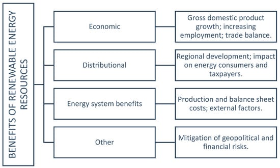It should be noted that over the past decades, renewable energy installation technologies have developed, and the main reasons for development have also changed—energy security, environmental issues, and energy availability. As already mentioned, the use of renewable energy resources includes various benefits—new jobs are created, the health and education system are improved, poverty is reduced and the negative impact on the environment is reduced. The benefits generated by renewable energy resources are discussed in more detail in Figure 1.