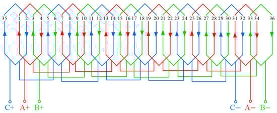 Figure 1 presents the topology of the low torque ripple PMSM for FESS. It can be seen that the proposed PMSM consists of two parts, including the outer stator and inner rotor. As the rated speed of the PMSM is 2500 rpm, a surface-mounted rotor structure is adopted after consideration. The permanent magnets are attached to the surface of the rotor. A high-temperature-resistant material is chosen for the permanent magnets to prevent irreversible demagnetization and ensure long-term, stable operation in high-temperature environments. In addition, by optimizing the polar arc shape of the permanent magnets, the magnetic flux density distribution in the air gap is close to a sinusoidal shape, which can reduce the cogging torque and torque ripple. Consequently, an eccentric design of the permanent magnets is adopted in the PMSM to reduce the torque ripple. The winding connection diagram of the PMSM for FESS is shown in Figure 2. It is evident that the serial numbers correspond to the slot numbers. The winding is divided into three phases, with each phase consisting of six coils connected in series. These six coils are sequentially connected, and each group of coils is wound in three strands, with 36 turns per strand. The armature winding of the PMSM for FESS features a single-layer structure, ensuring strong phase independence. Additionally, the integer-slot distribution winding structure has little impact on vibration and noise. Moreover, the structure parameters of the PMSM for FESS are listed in Table 2.