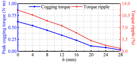 The eccentricity of the permanent magnet significantly affects the torque performance of the PMSM. Figure 5 shows the variation in the torque performance with respect to the eccentricity h. It can be observed that both the peak cogging torque and torque ripple decrease as eccentricity increases. When the eccentricity is less than 20 mm, there is a significant reduction in both the peak cogging torque and torque ripple. However, when the eccentricity exceeds 20 mm, the rate of decrease becomes less pronounced. Since the eccentric design of the permanent magnet reduces the amount of magnet material, the torque is also reduced. Moreover, the eccentric design causes the air gap to be unevenly distributed, affecting the waveform of the air gap magnetic density. Considering the torque performance of the PMSM, the eccentricity h is selected to be 20 mm.