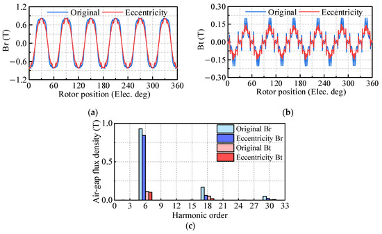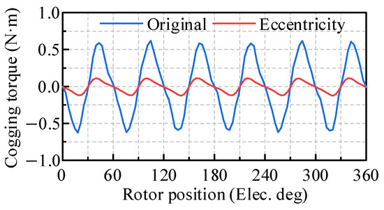 The cogging torque of the PMSM is analyzed using finite element analysis, both with and without eccentric permanent magnets, as illustrated in Figure 6. The results demonstrate that the eccentric design significantly weakens the cogging torque, reducing it from 0.62 N·m to 0.11 N·m. In order to further investigate the causes of the cogging torque reduction, a combination of finite element analysis and the analytical method is employed to assess the contribution of various harmonics to the cogging torque. The radial and tangential air gap magnetic densities of the PMSM, both with and without eccentric permanent magnets, are compared and analyzed, as shown in Figure 7a,b. It is evident that the eccentric permanent magnets cause the air gap to become uneven, and the air gap magnetic density waveforms more closely approximate a sinusoidal shape. Fourier decomposition is performed on the air gap magnetic densities, as shown in Figure 7c. It is apparent that the air gap magnetic densities are primarily composed of the 6th, 18th, and 30th harmonics, with the 6th harmonic being the most dominant. The eccentric design does not introduce new harmonic orders, but it reduces the amplitude of the radial and tangential air gap magnetic density harmonics, with the most significant reduction observed in the 18th harmonic.