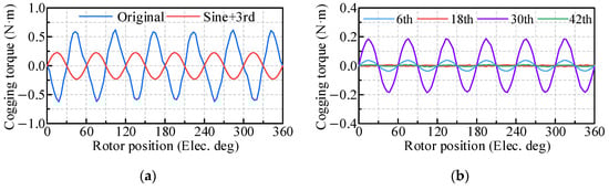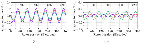 Cogging torque contribution of different harmonics. (a) PMSM with original permanent magnets. (b) PMSM with eccentric permanent magnets.