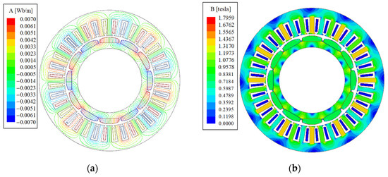 Based on the analysis of the torque performance of the PMSM with different permanent magnet structures, the structure with permanent magnets having a 20 mm eccentricity is selected as the final design proposal. Therefore, the final finite element model of the PMSM is determined. The electromagnetic performance of the PMSM for FESS can be simulated and analyzed by using the Ansys Maxwell 2022R1 software. In finite element analysis, a boundary condition with zero magnetic flux is set outside the PMSM model. In addition, the simulation results are exported by finite element software and plotted in Origin 2019b software. The load magnetic field line distribution of the PMSM is shown in Figure 11a. It can be seen that the magnetic field line distribution is symmetrical, with each magnetic field line being nearly perpendicular to the air gap, thereby forming a closed magnetic circuit. In addition, the load magnetic flux density distribution of the PMSM is depicted in Figure 11b. It is apparent that no saturation occurs in the PMSM, and the magnetic flux density in the stator and rotor core yokes is relatively low. The magnetic flux density in the stator teeth, influenced by the number of pole-pairs, is significantly higher, with the maximum value reaching approximately 1.5 T.