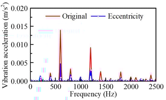 The no-load back electromotive force of the PMSM is solved by finite element analysis, as shown in Figure 12. It is observed that the peak no-load back electromotive force is 257 V at a speed of 2500 rpm, and the no-load back electromotive force coefficient is 0.103 V/rpm. The no-load back electromotive force waveform exhibits excellent sinusoidal characteristics. Additionally, the torque performance of the PMSM with eccentric permanent magnets is shown in Figure 13. It is evident that the cogging torque of the PMSM is only 0.11 N·m. The torque fluctuates between 10.42 N·m and 10.75 N·m, with an average torque of 10.55 N·m. The torque waveform of the PMSM is smooth, with a torque ripple of only 3.1%, all due to the eccentric structure of the permanent magnets. Moreover, the vibration acceleration of the PMSM is analyzed and compared, both with and without eccentric permanent magnets, as shown in Figure 14. It can be seen that the vibration acceleration of the PMSM with eccentric permanent magnets is significantly lower than that of the PMSM with original permanent magnets.