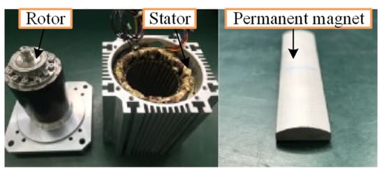 This article analyzes the effects of eccentric permanent magnets and harmonic injection on cogging torque. By calculating the contribution of each harmonic order to the cogging torque, the underlying causes of torque ripple reduction are clarified. The contribution of each harmonic order to the cogging torque under different PMSMs is listed in Table 3. It can be seen that the eccentric permanent magnets and harmonic injection have varying degrees of impact in reducing the cogging torque generated by different harmonics. The cogging torque of the PMSM with eccentric permanent magnets is only 0.11 N·m, which is 0.12 N·m lower than that of the PMSM with harmonic injection. Additionally, the torque performance of the PMSM with different permanent magnets is listed in Table 4. It is evident that the average torque of the PMSM with harmonic injection is 10.67 N·m, only 0.12 N·m higher than that of the PMSM with eccentric permanent magnets. However, the torque ripple of the PMSM with eccentric permanent magnets is significantly lower than that of the PMSM with harmonic injection. Consequently, the prototype of the PMSM with permanent magnets exhibiting a 20 mm eccentricity is built to verify the theoretical analysis.