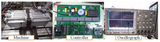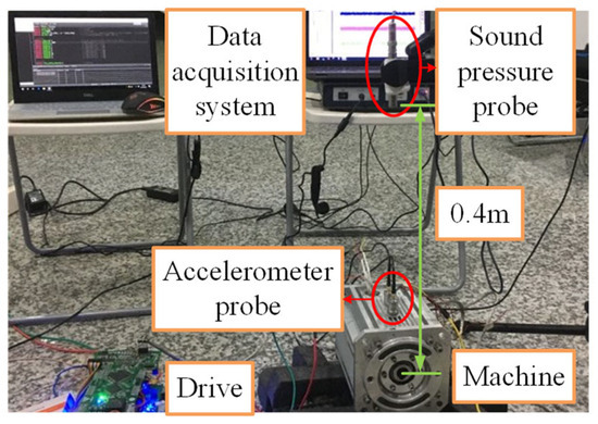 Based on the theoretical analysis above, the proposed low torque ripple PMSM for FESS can be built and tested. When manufacturing the prototype, attention must be given to the magnetization direction of the permanent magnets, the dimensional accuracy of the machine components, and the potential for permanent magnets to detach during operation. The photograph of the prototype is shown in Figure 15. The permanent magnets are eccentric, with an eccentricity of 20 mm. To mitigate the risk of the permanent magnets detaching from the rotor core, a sheath made of carbon fiber is added to the rotor surface. The experimental platform of the prototype is set up, as shown in Figure 16. It can be seen that the experimental platform consists of two machines, a machine controller, and an oscilloscope. One of the two machines drives the other machine and connects an oscilloscope to the terminals of the three-phase winding. When one machine drives the other machine to run, the oscilloscope displays the no-load phase voltages of the PMSM. The actual speed of the PMSM can be estimated from the frequency displayed on the oscilloscope. The vibration and noise test platform of the prototype is shown in Figure 17. The platform primarily consists of a machine driver, a data acquisition system, a sound pressure probe and an oscilloscope. In this experiment, the acceleration measurement probe is fixed to the outer surface of the machine to measure the vibration and noise.