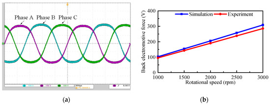 The no-load back electromotive force waveform of the PMSM for FESS is measured at a speed of 2500 rpm, as shown in Figure 18a. It can be seen that the waveform of the no-load back electromotive force is sinusoidal, with little harmonic content. The amplitude of each phase is approximately 240 V, indicating no asymmetry in amplitude. The experimental and simulated values of the no-load back electromotive force at various speeds are compared and analyzed, as shown in Figure 18b. The experimental back electromotive force coefficient is calculated to be 0.096 V/rpm, which is slightly lower than the simulated value. The discrepancy between the simulated and experimental no-load back electromotive force coefficient of the PMSM remains constant. Consequently, as the rotational speed increases, the discrepancy between the simulated and experimental no-load back electromotive force also grows.