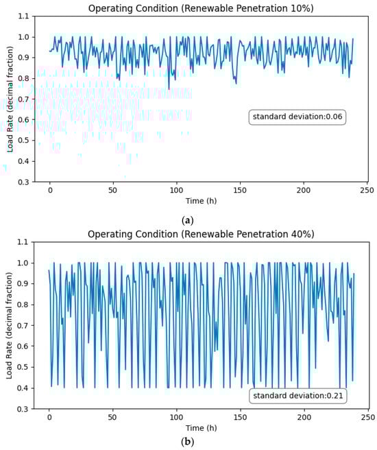 Operating conditions of coal-fired power units under different renewable energy penetration ratio in HRP-38 system. (a) 10% renewable energy penetration, (b) 40% renewable energy penetration.