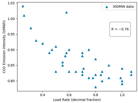 Load rate and CO2 emission intensity relationship of 300 MW coal-fired power unit.