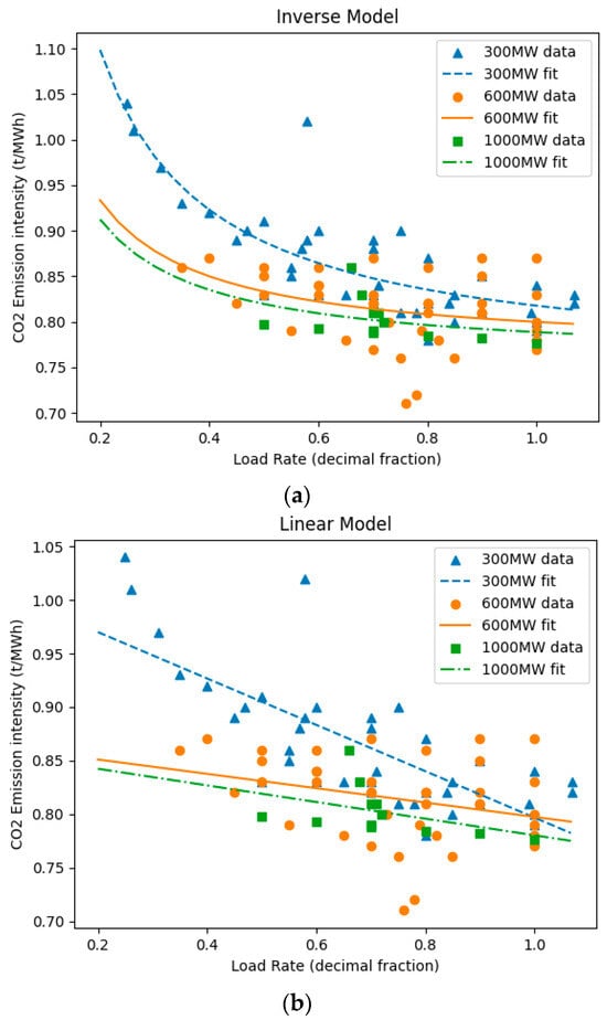 The inverse model more accurately captures the carbon emission characteristics of coal-fired units across different load rates, especially the “diminishing marginal returns” phenomenon observed at higher load rates. This phenomenon reflects saturation of combustion efficiency during high-load operations, leading to a slower rate of carbon emission reduction. The inverse model’s mathematical structure naturally reflects this nonlinear relationship, whereas both the linear and quadratic models fail to adequately capture the emission reduction trend during high-load intervals. As depicted in Figure 3c, the quadratic model, for instance, does not replicate this trend when applied to the 1000 MW unit.