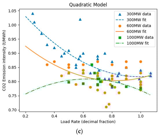 Different methods for fitting carbon emissions and load rate: (a) Inverse model; (b) Linear model; (c) Quadratic model.