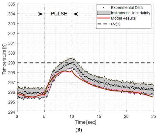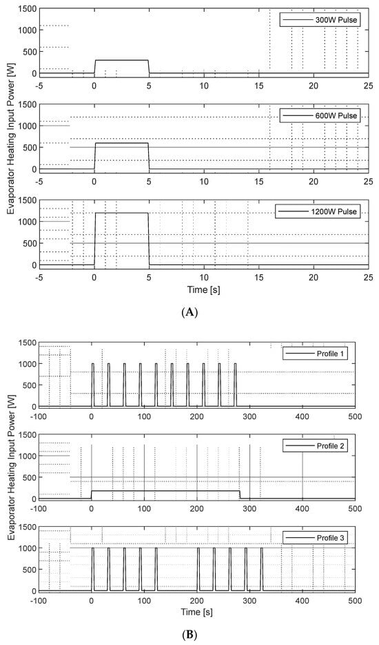 To compare the experimental results with the numerical model for validation, a 25-s measurement window, , was defined. The measurement window was defined as a five-second pre-evaporator load pulse (), five-second evaporator load pulse (), and then fifteen seconds after the evaporator load pulse response ().