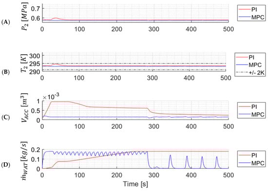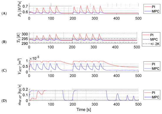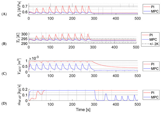 31]. There were no noted issues with model convergence. The initial conditions were manually assigned to match the experiment data five seconds before the pulse, to prevent numerical initialization errors from impacting the results. To evaluate the control scheme’s impact on transient performance, a PI controller and an MPC controller were designed and implemented in the numerical model.