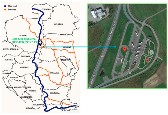 For this study, one of the rest areas located along the S19 expressway, which is part of the Via Carpatia route, was selected. Via Carpatia is a key trans-European transport corridor that has the potential to become a new north-south connection in Europe, integrating the transport systems of Lithuania, Poland, Slovakia, Ukraine, Hungary, Romania, Bulgaria, Greece, and Turkey (the Via Carpatia route is marked in green in Figure 1). Currently, the route is partially operational, with other segments under construction or in the planning stages. Its total length spans several thousand kilometers, with approximately 700 km passing through Poland.