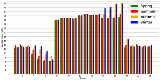Based on reports provided by the facility manager, the water and energy demand for the analyzed site was calculated. The Python 3.12.3 programming language was used to detect measurement deviations and to preprocess and prepare the data. The calculations considered electricity consumption by individual devices, such as hand dryers, water heaters, and pressure tanks, as well as external and internal lighting. The frequency of building usage by visitors was also taken into account. The daily demand for the reference year, divided by seasons, is shown in Figure 2. The variability in energy demand revealed a daily fluctuation of 2.603% and an hourly fluctuation of 21.575%.