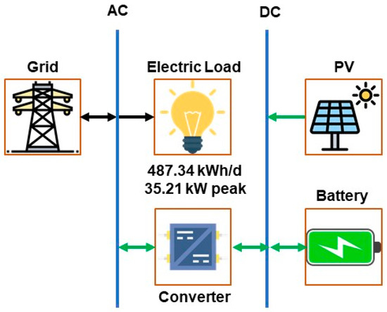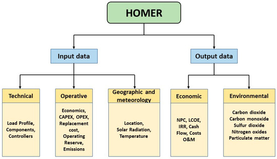 This study employed the HOMER software (Hybrid Optimization Model for Electric Renewables), version 3.18.3 Pro Edition [44]. This advanced tool enables the optimization and modeling of energy systems, including hybrid configurations powered by various energy sources [45]. Its main functions are simulation and optimization. The simulation process allows the examination of a specific HRES configuration’s performance over the course of a year to assess its technical feasibility and life cycle cost. The program then evaluates multiple HRES variants to find the financially optimal solution. HOMER software utilizes historical or forecasted climate data, which are crucial when designing HRES. Figure 6 shows the general scheme of input and output data required for proper HRES optimization using HOMER.