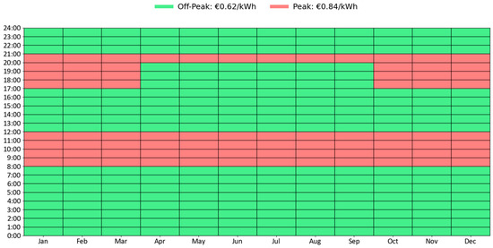 The rest area building is connected to the distribution grid and operates under the dual-rate C12a tariff. Figure 5 presents the electricity prices for 2024, distinguishing between peak and off-peak hours. Peak hours are billed at EUR 0.84/kWh, while off-peak hours are charged at EUR 0.62/kWh. In addition to the variable energy costs, consumers are required to pay a fixed monthly fee, which amounts to EUR 26.95 annually.