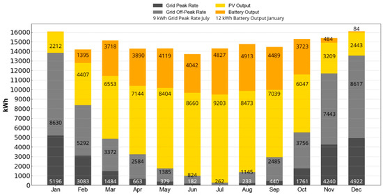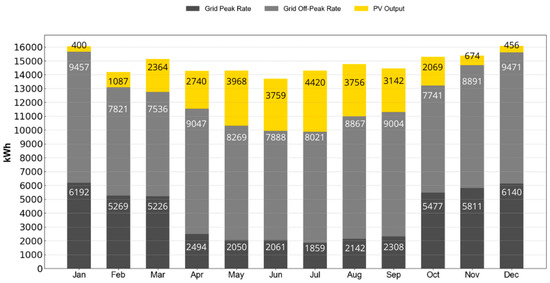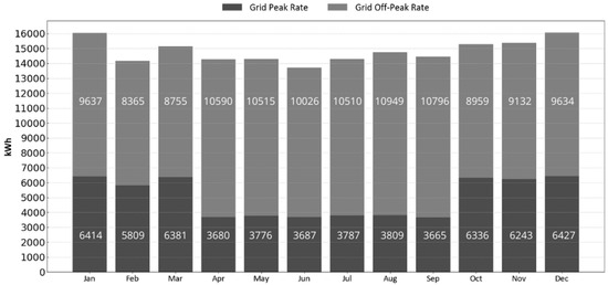 Due to the absence of an energy storage module and demand management systems, the user has limited flexibility in shaping the energy purchase schedule, which affects operational adaptability. Figure 7 shows the annual energy purchase balance, highlighting a significant dominance of off-peak energy consumption. During winter months, energy usage in peak hours (Grid Peak Rate) increases, which is linked to higher lighting demand. In the summer period, from April to September, peak energy consumption remains at a similar level, while more energy is consumed during off-peak hours (Grid Off-Peak Rate).