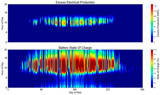 The PV installation in Scenario 2 increased by 194 kWp compared to Scenario 1 of Variant 2. Maximum instantaneous power of the PV installation reached 177 kW, with an average production of 40.12 kWh during operational hours. The optimization results indicate the cost-effectiveness of an energy storage unit with a capacity of 249 kWh. In the reference year, the storage accumulated 41,839 kWh and supplied 35,697 kWh of demand, with an autonomy factor of 9.81 h. The storage works in tandem with PV production, charging during daily surpluses and discharging after dark, resulting in a 61.6% share of renewable energy in the annual balance. However, the limited storage capacity and increased PV power lead to unused energy surpluses, accounting for 20.8% of total production. The battery does not charge from the grid in any iteration, due to minor price differences between peak and off-peak hours, as well as losses incurred during battery charging, discharging, and DC-AC transitions. A more cost-effective and efficient solution is to use grid energy directly when PV surpluses are unavailable. Figure 9 illustrates the frequency of unused energy surpluses and the battery’s state of charge throughout the year. When the battery reaches 100% charge, the system discards excess energy that cannot be utilized. This situation primarily occurs in the summer months with high solar radiation, where PV production exceeds immediate demand and storage capacity. These surpluses could be effectively used to power air conditioners and charge electric vehicles, optimally utilizing surplus energy during peak cooling and electric vehicle charging demand (a period with high vacation travel), further increasing the system’s energy efficiency.