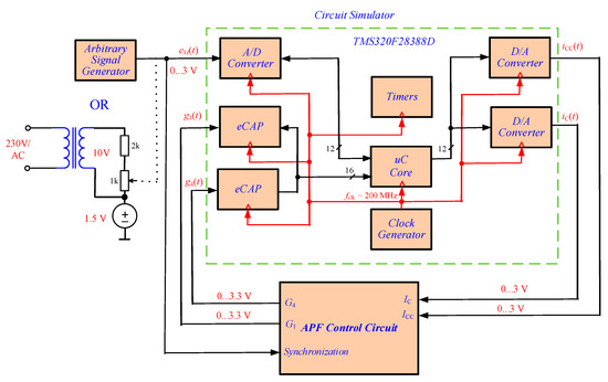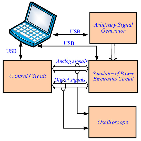 A block diagram of the considered simulation circuit of the power electronic system is depicted in Figure 2. The circuit consists of a simulator of the power electronics circuit (analog or digital), a control circuit power electronics circuit, an arbitrary signal generator, and an oscilloscope.