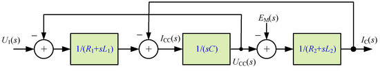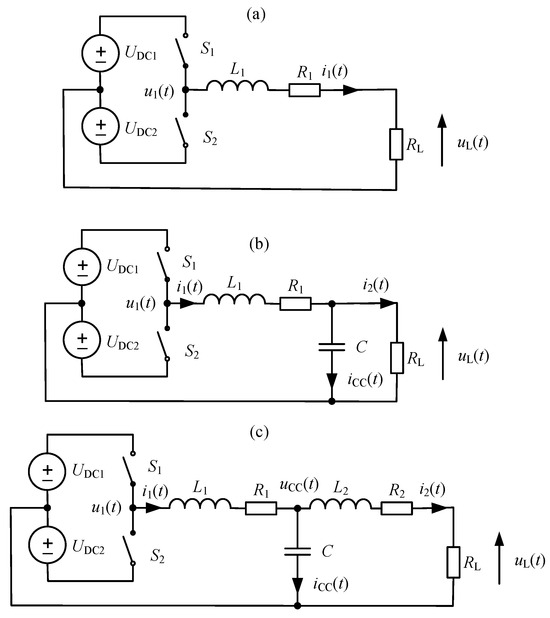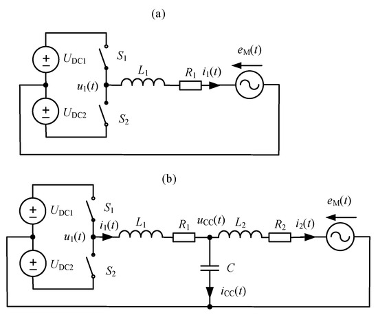 Figure 4 shows two circuits with first-order and third-order current outputs. The voltage eM(t) represents the supply network voltage. In the case of the first-order circuit (Figure 4a), L1 represents the inductance of the inductor and the supply network, while R1 represents the output resistance of the inverter, the inductor L1, and the supply network. For the third-order circuit (Figure 4b), the situation is similar for L2 and R2.